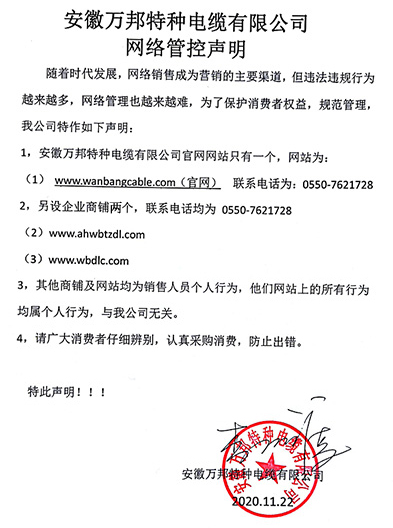 鄭重聲明:安徽萬邦特種電纜有限公司官方網站為:www_wanbangcable_com.zangsui.cn,除此之外無任何子網站或合作網站,其余均為假冒偽劣。電話:0550-7621728 13485756353 地 址:安徽省天長市滁州高新技術產業開發區經四路29號